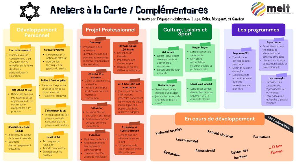Les « Ateliers à la Carte » sont des moments collectifs, ouverts à tous, rassemblant des jeunes et des adultes inscrits à la MELT. Le principe de ces collectifs, qui peuvent être intergénérationnels, est de créer une cohésion de groupe, d’établir une interaction entre les participants et de vivre une expérience collective.